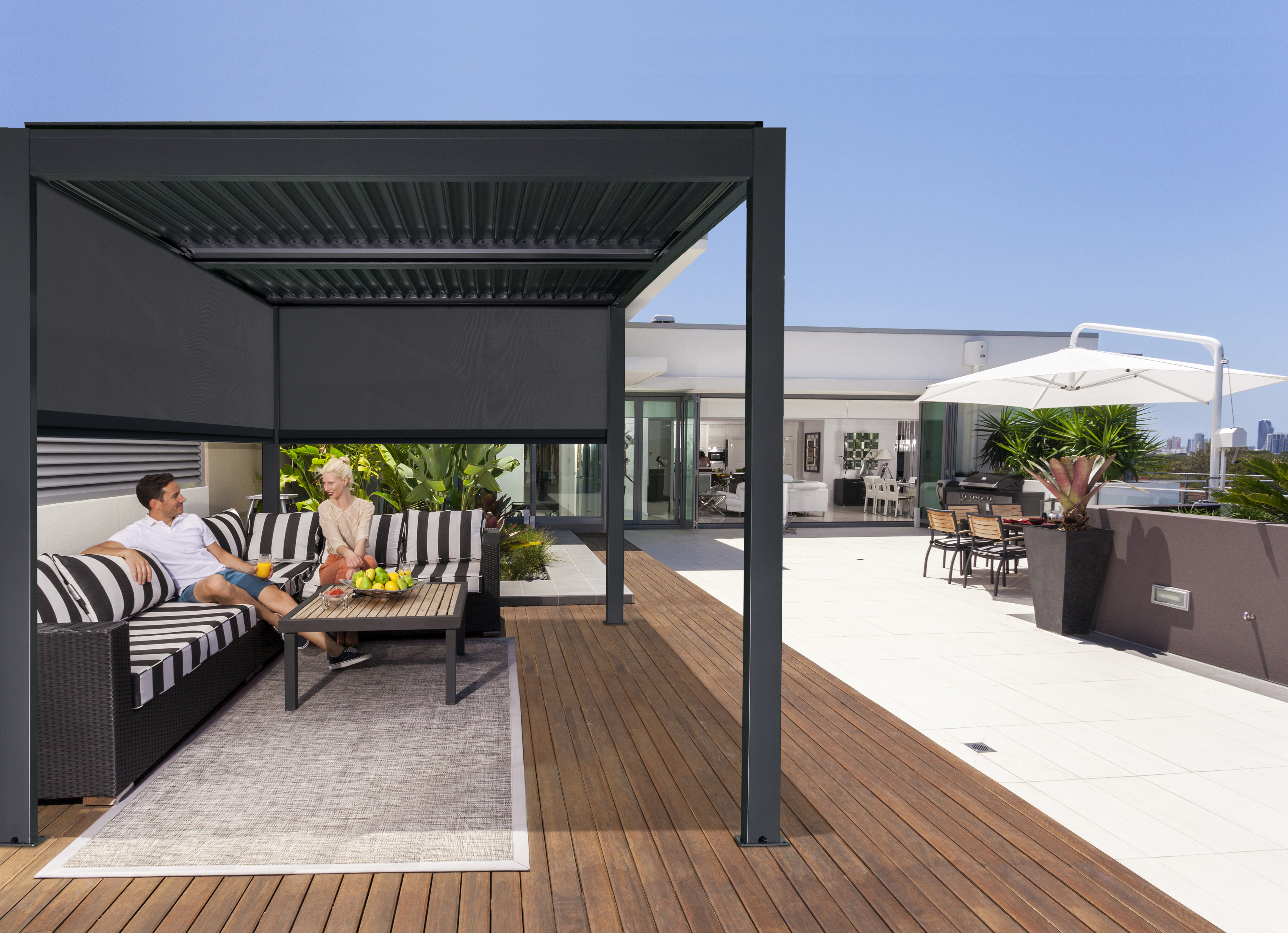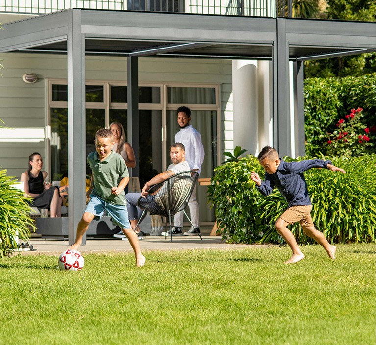 Stylish louvred aluminium pergolas offering manual or motorised louvres, optional LED lighting, and heavy-duty construction.