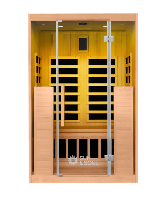 Experience ultimate relaxation with the SUN200™ 2-Person Infrared Sauna from Sun & Soul™. This beautifully crafted sauna features low-EMF carbon heaters for consistent, deep heat, along with durable spruce wood design for warmth and style.