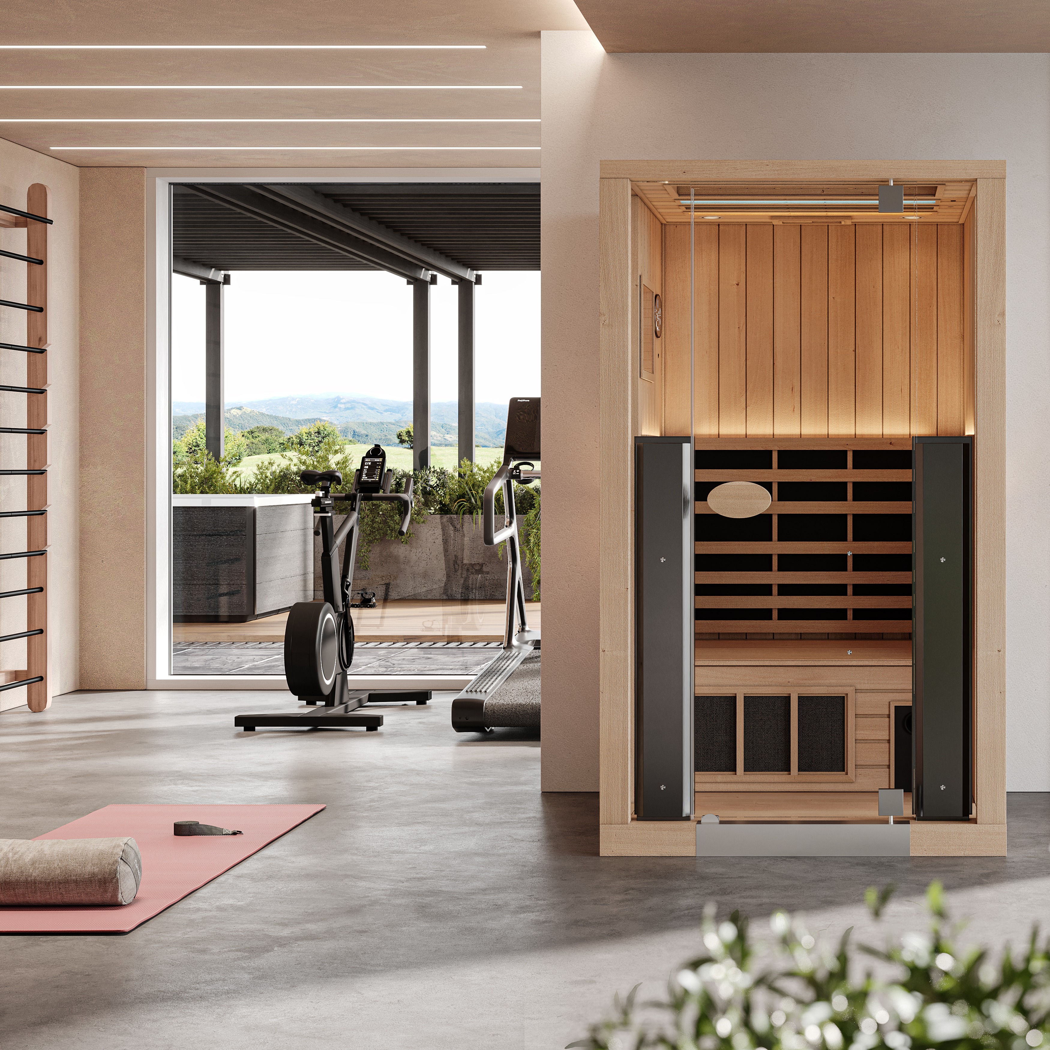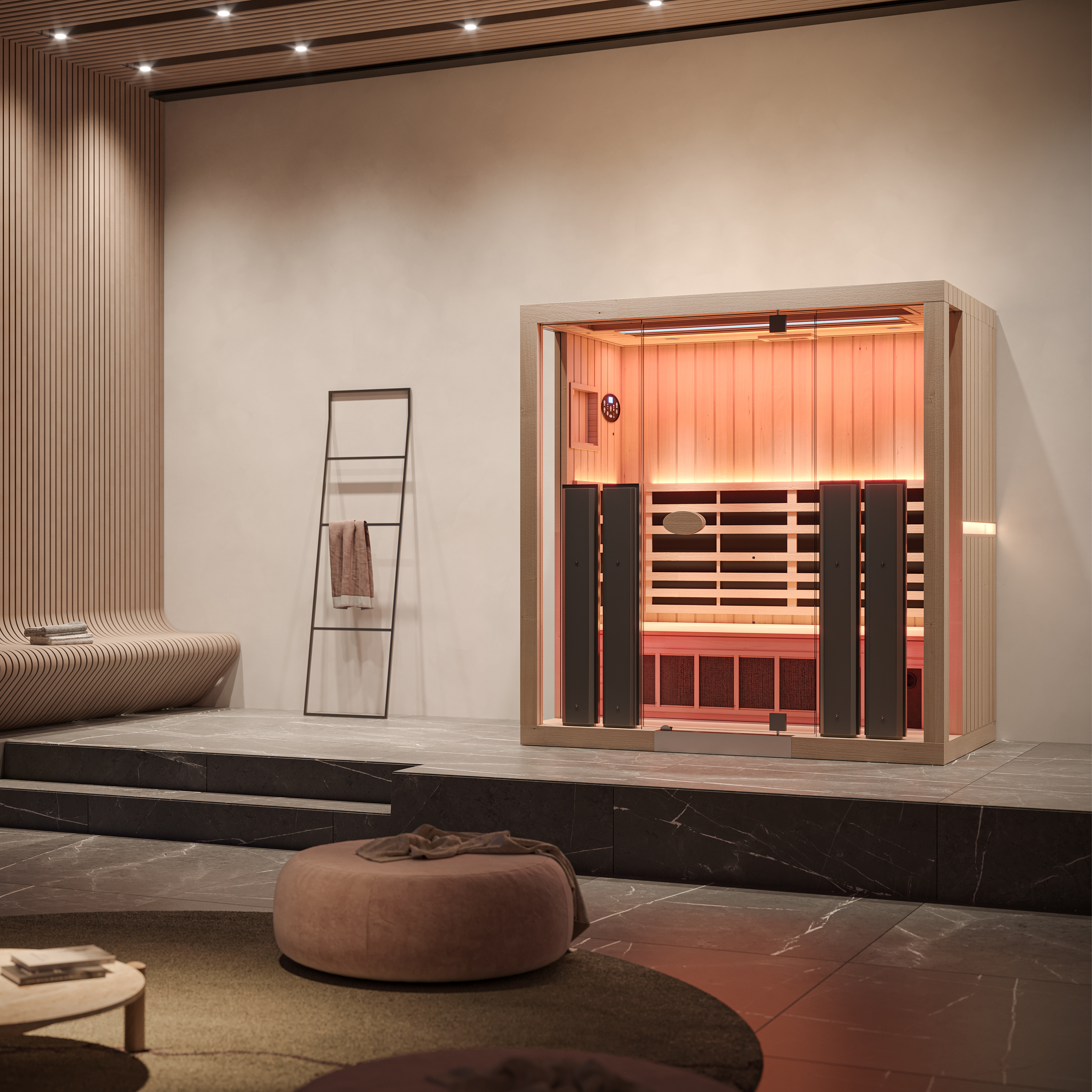 A sauna suits this environment by providing a space for relaxation and recovery from daily stresses or physical exertion. It also serves as a cosy haven during the region's cooler, windy weather and helps maintain a wellness routine throughout the year.